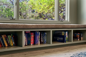 The Master Bedroom offers a king bed, a spacious layout, a private TV, large windows for natural light, and a cozy reading nook with a small table, chair, and standing lamp. It also includes a twin rollaway bed for additional sleeping space.