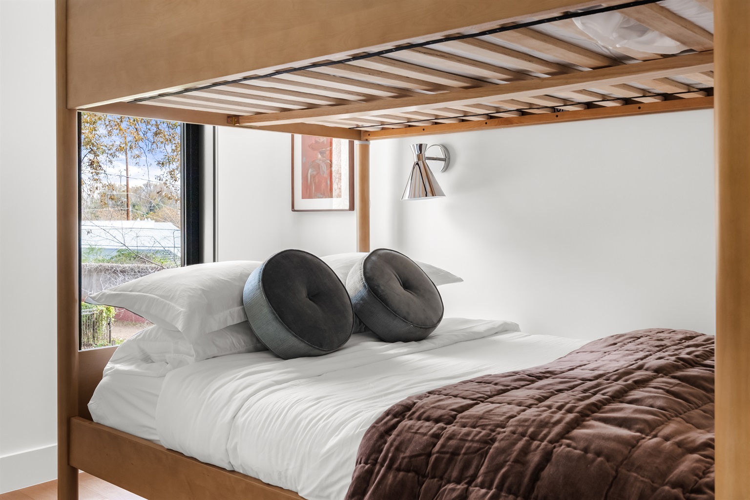 A bright and playful room with a full-over-full wooden bunk bed, a fun zebra-print rug, and a skylight. Ideal for kids, teens, or anyone looking for a unique and comfortable stay.