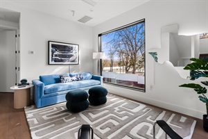 Elegant king bedroom with designer finishes and expansive views. The nearby second-floor living area includes a queen sleeper sofa for additional sleeping flexibility.