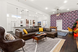 Our home's interior is a testament to style and comfort, featuring an accent wall with energizing wallpaper, handmade beds from an Austin-based craftsman, and a large leather sectional couch. Art curated from our travels and unique wallpaper add touches of elegance and creativity throughout the space.