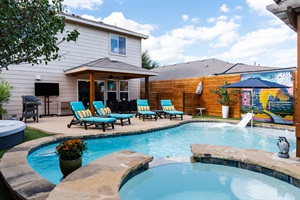Open the glass sliding doors and step out into paradise! Our private backyard oasis with a sparkling blue 30ft in-ground pool and spa surrounded by lush greenery and artificial turf. Our 8ft fence not only features the "Much Love from ATX" mural but also ensures privacy, making it the perfect spot to unwind and soak up the sun. We have a 5-person daybed that can be arranged to have a table in the middle as well. Get ready for your IG pics! Directly under the patio cover, there is a 6-person dining table. Towards the back of the yard, if you make your way around turfed area to the cedar pergola you will find a lounge area and bar seating! You can't have a perfect backyard without an outdoor TV and propane grill! The perfect backyard haven whether you prefer to take a refreshing swim or if you just want to lounge poolside. We heat the SPA for free and can heat OR chill the pool to 85 degrees for free (Mar 1-Nov 1), and $50/day for 90°.