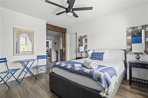 Cuba: Step into our primary suite which has a tropical Cuban vibe. Enjoy a king-sized bed and an ensuite bathroom with a luxury walk-in shower and a double vanity sink. The bathroom was just remodeled Oct23 so it's brand new and sparkling! Notice the Cuba flag decal spanning across the blue wall, subtle but beautiful!